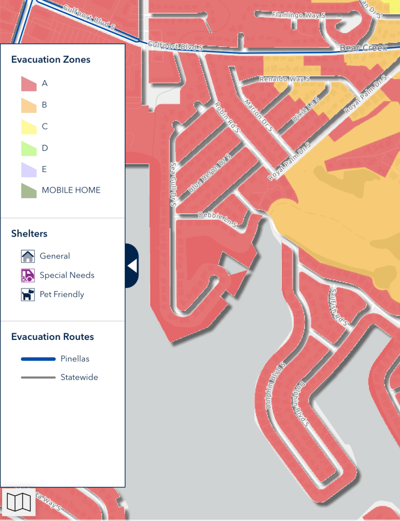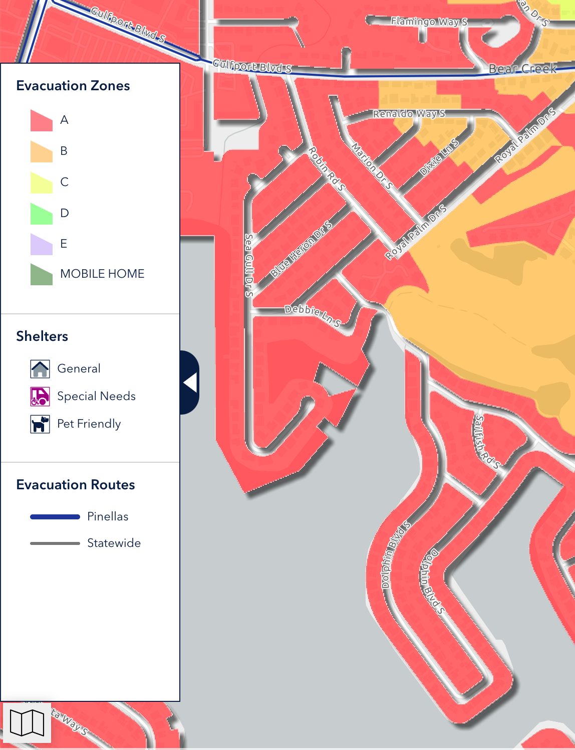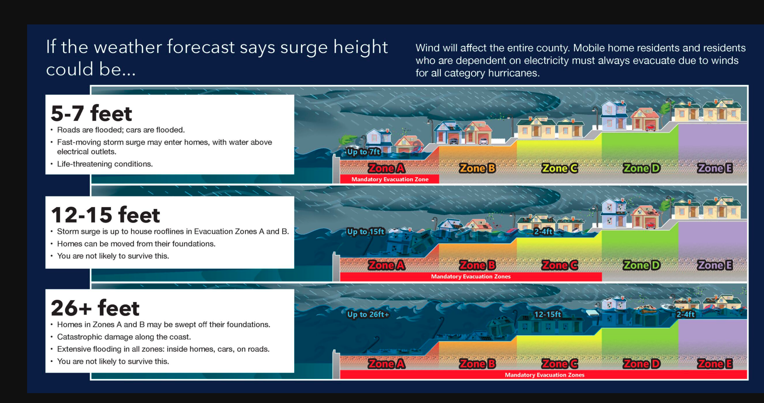 Storm surge is not the same thing as your evacuation level, even though the two mapping tools can look similar. While hurricane evacuation zones are based on storm surge, they also consider other public safety factors such as being cut off from first responder support. For example, properties on barrier islands that are connected to the mainland by a bridge are all considered to be in a Level A evacuation due to the risk to the bridge and to citizens being isolated, even if the application doesn’t show any storm surge on the parcel for that evacuation level.