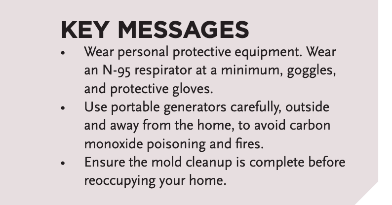 • Protect your mouth and nose against breathing in mold: wear at least an N-95 respirator. If you plan to spend a lot of time removing moldy belongings or doing work like ripping out moldy drywall, wear a half-face or fullface respirator. Basic information on using it is in OSHA’s general respiratory protection guidance.