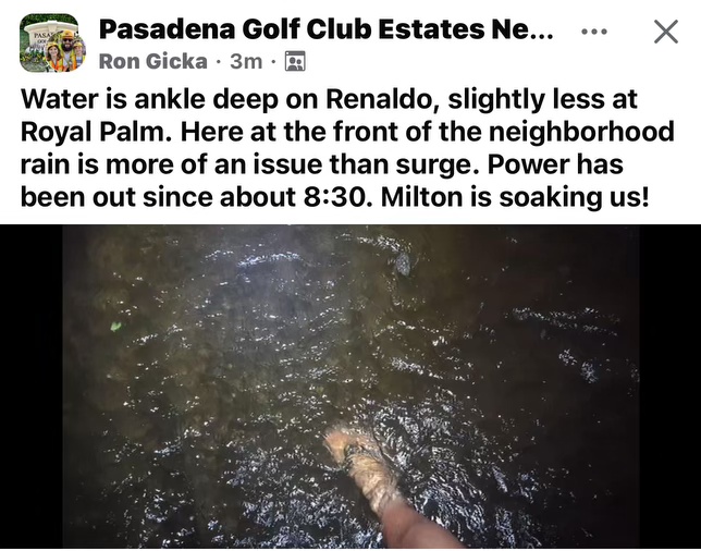 You are looking from the entrance of Robin Road toward Royal Palm. As you know this was one of the real problem spots during Helene when the drain at the end of the street was overwhelmed while the drain on Pasadena Avenue was pouring water out of Bear Creek into our neighborhood. This image shows while there is some flooding, it is a long way from what we saw in Helene. We are not out of the woods, but it is encouraging that we do not have a flood at this point in the ordeal. A million thanks to Jamie Burge for the image.