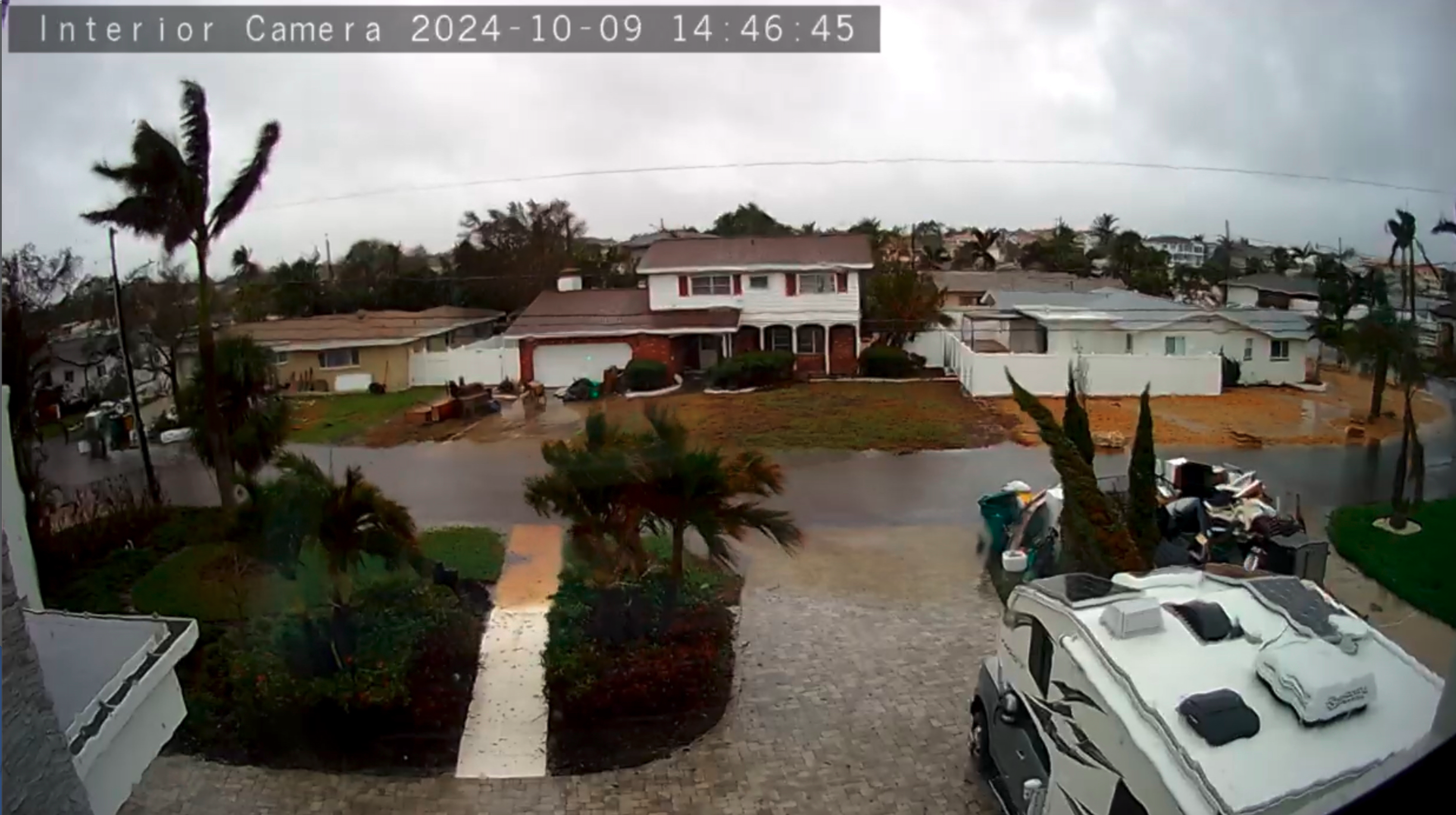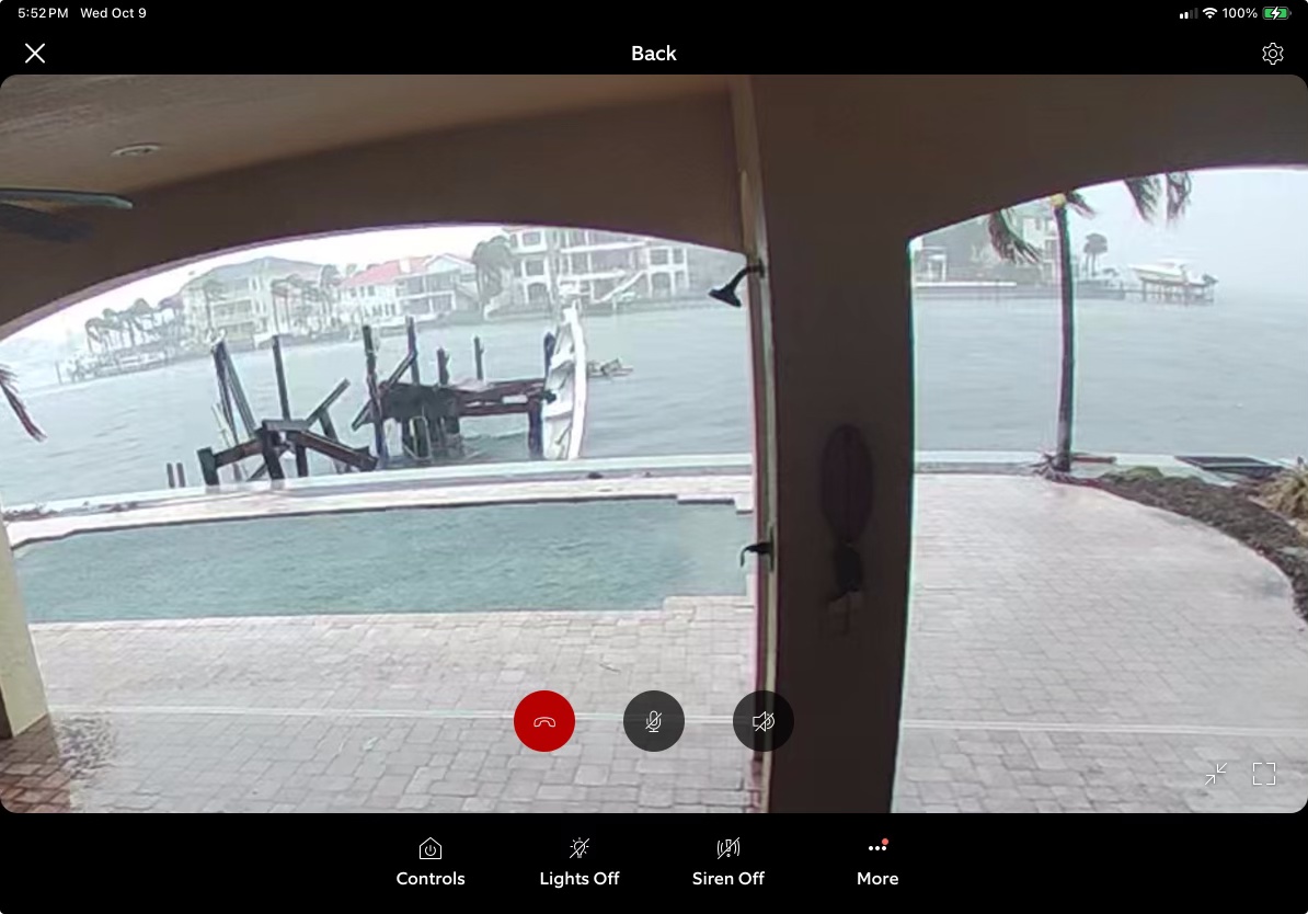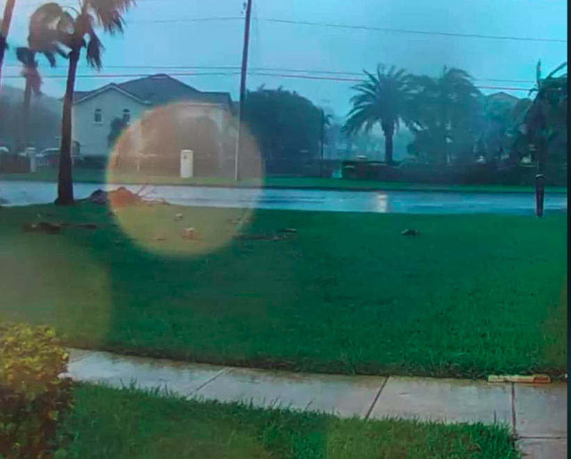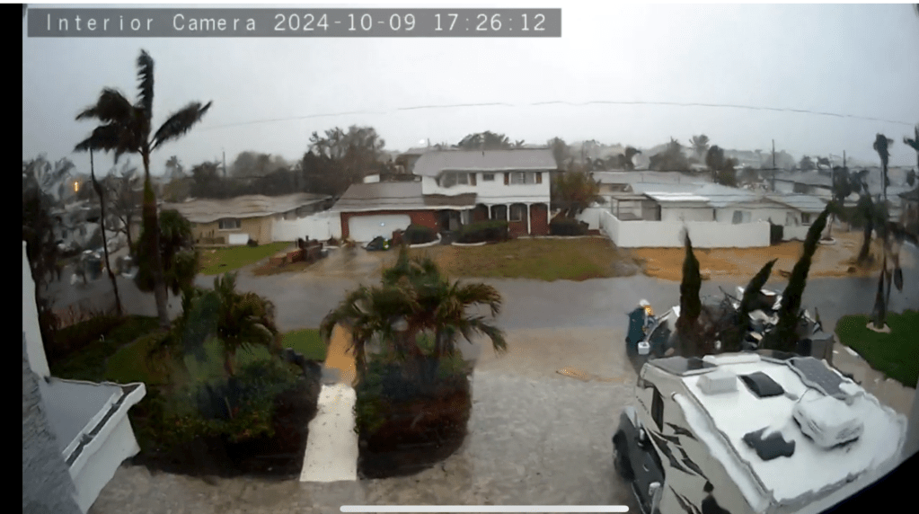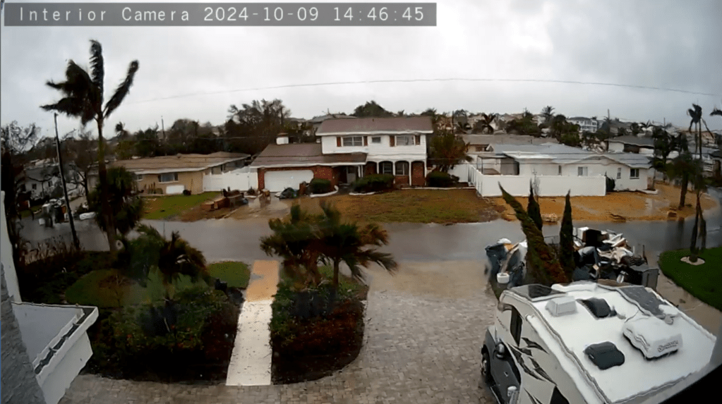 Home security camera on Dolphin shows water pooling on the street and starting to edge up on driveway. (photo sent by Lynda Velanovich-1972 Dolphin