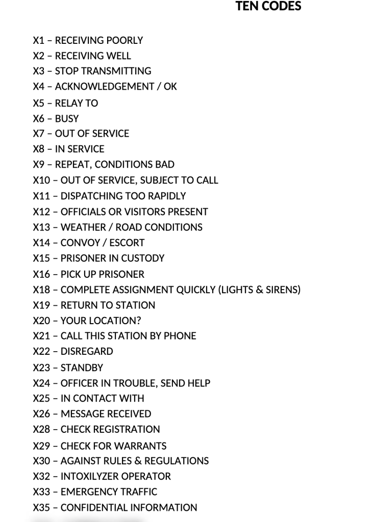 I am attaching the 10-code guide to help you understand police-speak on scanner communications.