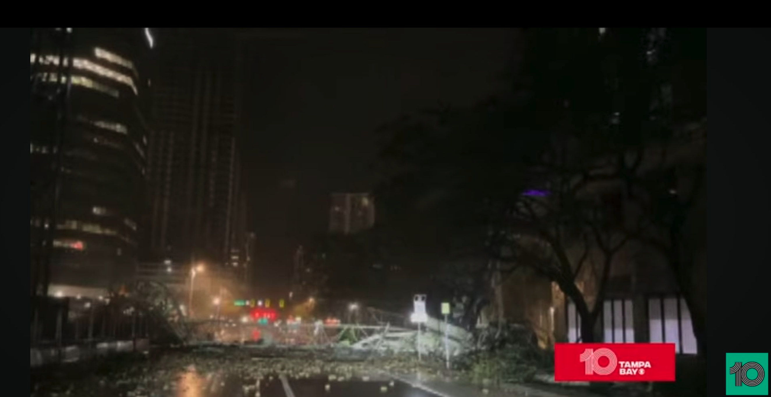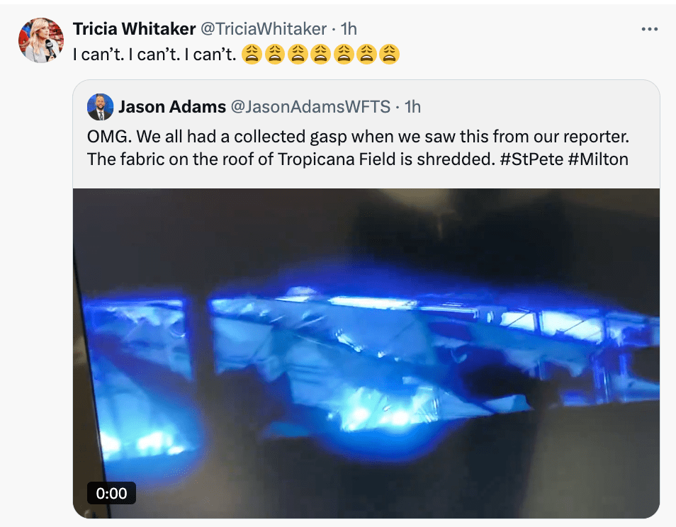 Eyewitnesses say the stadium roof is in tatters, waiving in the wind. The Trop was hosting hundreds of lineworkers who came to St. Pete to repair power lines. However, Tricia Whitaker, the field reporter for the Rays, reported that there were no first responders still staged at the Trop when the roof blew away. The fabric roof was reported to be able to withstand 120 mph winds.