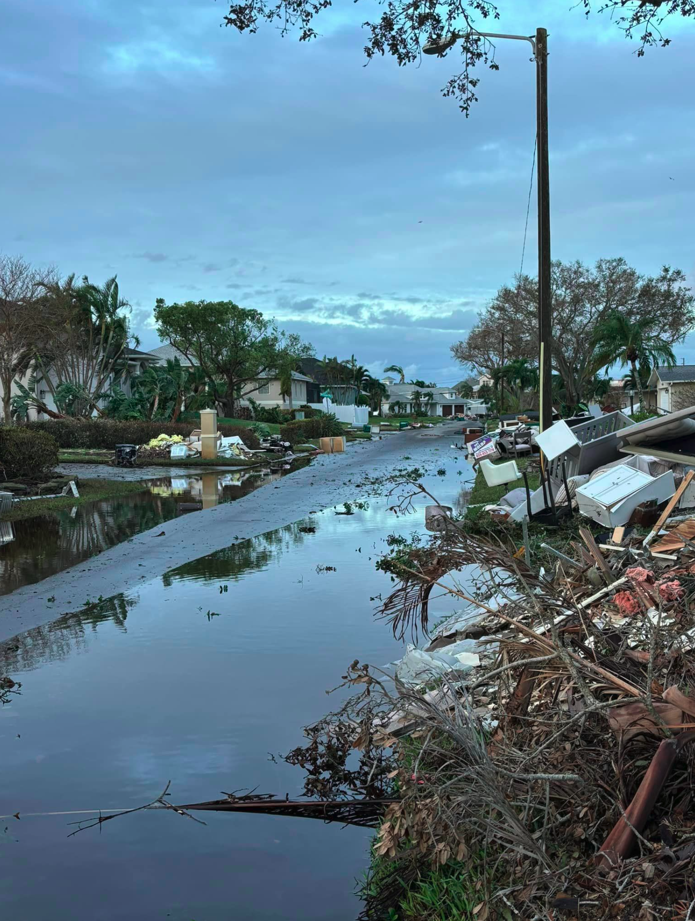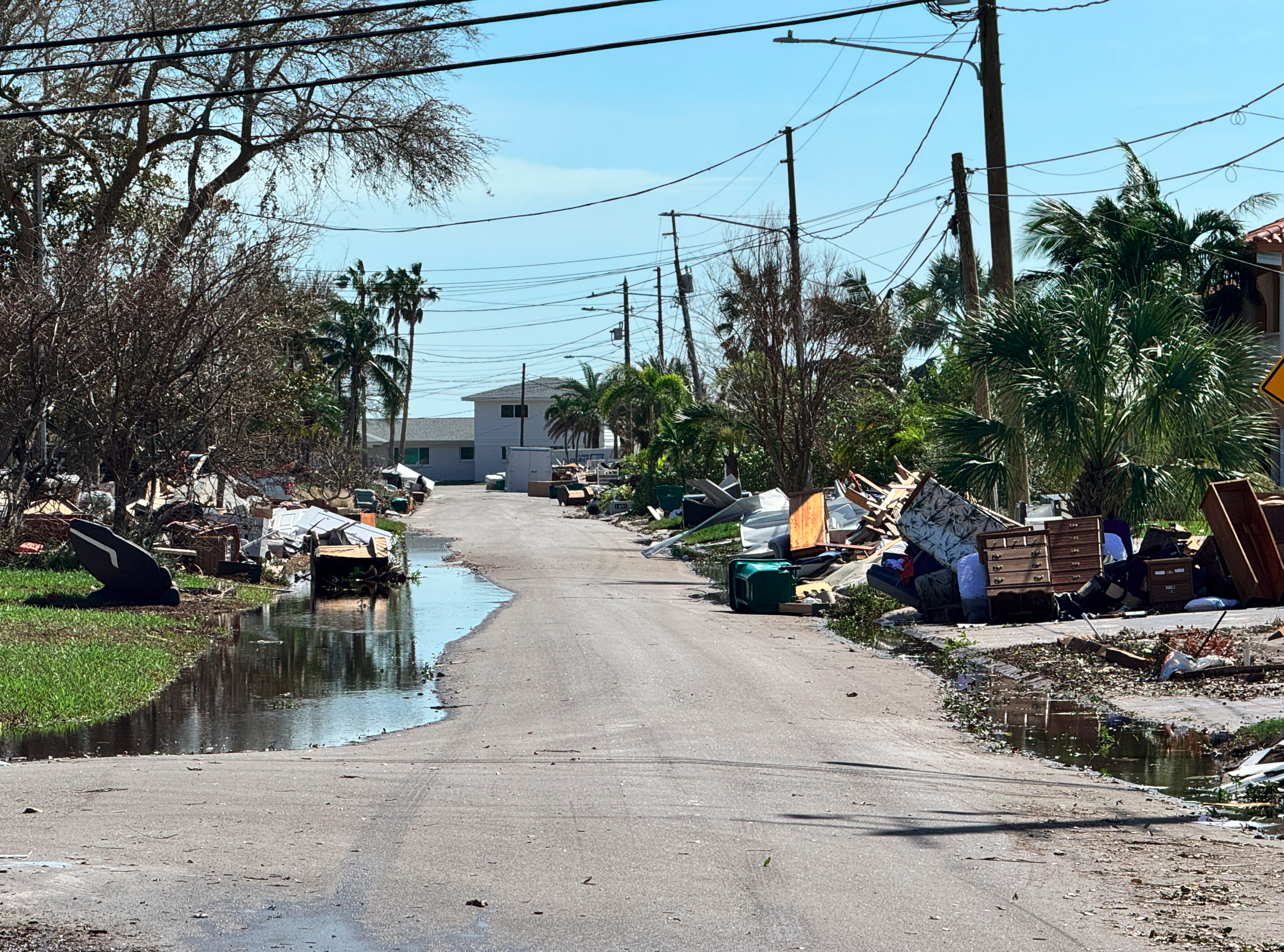 There is standing water at the end of Sea Gull and a power pole in the middle of the road. Ryan said it is clear the power outage will be lengthy because it will require rebuilding some lines in the neighborhood.